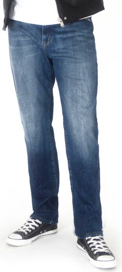 Light sanding and whiskering burnish the inky blue wash of jeans crafted in a fit that's easy and relaxed with a touch of stretch for comfortable movement.