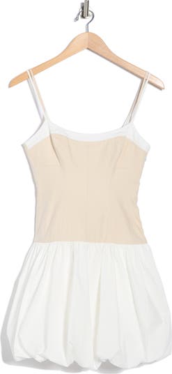 A colorblocked bodice creates the illusion of layering in this flirty minidress finished with an artfully gathered bubble hem.