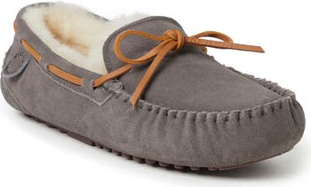 Naturally comfortable genuine shearling lining provides moisture wicking and regulates temperature when you wear these cozy moc toe slippers.