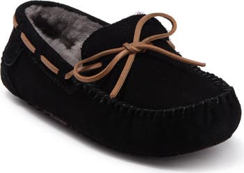 Naturally comfortable genuine shearling lining provides moisture wicking and regulates temperature when you wear these cozy moc toe slippers.