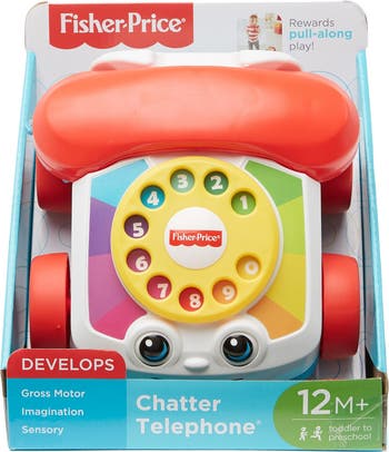 With its friendly face, spinning dial, fun ringing-phone sounds, and eyes that move up and down as you pull it along, the Fisher-Price® Chatter Telephone® helps get your baby chatting—and strolling—like a pro! - Babies can sit & play or pull it along - Chatter Telephone® features fun ringing sounds and eyes that move up & down - Dial introduces numbers 0-9 - Encourages early role play - For infants and toddlers ages 12 months and older - Imported