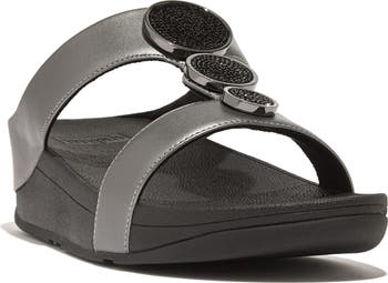 A trio of rhinestone-pavé discs accent the double-strap vamp of a cushy wedge sandal perfect for dressing up those off-duty days. A signature supercushioned, pressure-diffusing Microwobbleboard™ boosts everyday stability.