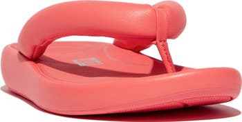 Puffy vamp straps add modern intrigue to a leather flip flop grounded by a cushioned footbed and slip-resistant rubber sole.
