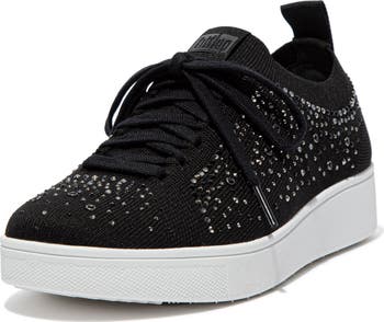 Sparkling rhinestones add charm to a trainer sneaker with a breathable knit upper built on a flexible sole with lightweight cushioning for added support.