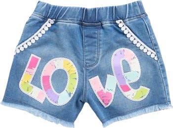 A colorful sequined love script spans the front of these denim shorts finished with pompom lace-trimmed pockets and frayed hems.
