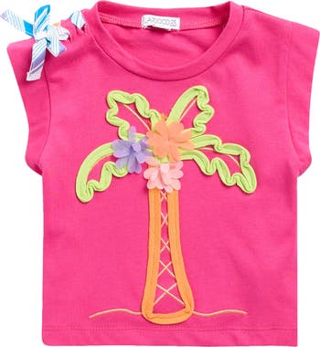 A patterned bow at the shoulder sweetens this comfy cotton-blend T-shirt fronted with a tropical appliquè that brings a resort vibe to your kiddo's wardrobe.