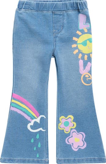 Sun, flower and rainbow graphics lend kid-approved flair to denim-inspired pants cut with trendy flared legs to appease your budding fashionista.
