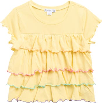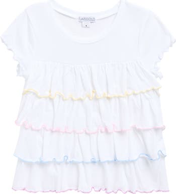 Tiered ruffles with colorful lettuce edging puts a playful spin on this tot-sized top made from a supersoft cotton blend.