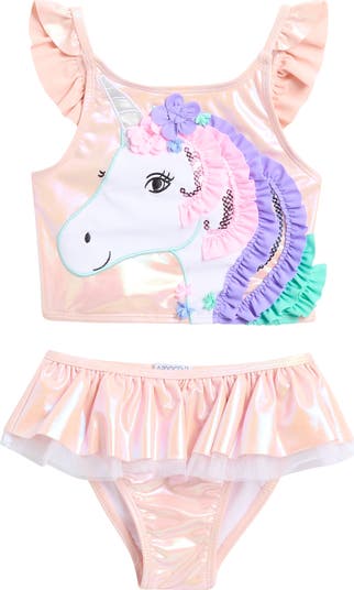 Beach days are more magical in an iridescent swimsuit fixed with ruffles and featuring a friendly unicorn.