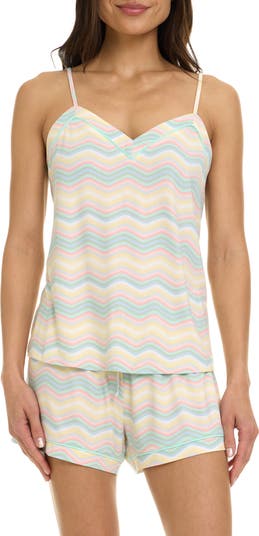 A sweetheart neckline and piped edging bring a luxe vibe to these soft and stretchy jersey pajama pieces featuring airy camisoles and matching drawstring shorts.