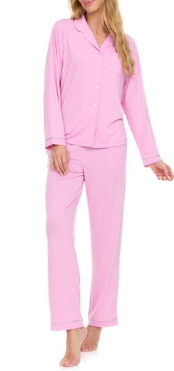 Metallic piping brings a hint of glamour to a soft knit pajama set including a long-sleeve button-up top and matching pants.