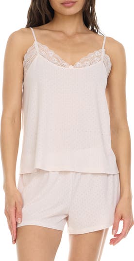 You'll doze off into dreamland easily in these camisole and shorts pajamas cut from soft pointelle knit with sweet lace and rosette accents.