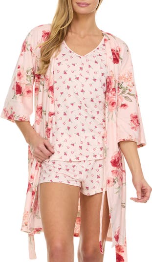 Refresh your downtime with this three-piece pajama set that complete with a V-neck tank, shorts and floral robe made for travel.