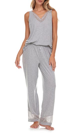 Get comfy in this soft knit pajama set including a relaxed fit V-neck tank top and matching pants trimmed in romantic floral lace.
