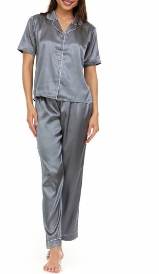 Drift off into dreamland in these soft satin jacquard pajamas that pair a notched collar top with elastic waist pants.