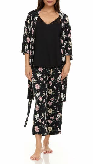 Drift off in this soft knit pajama set including a romantic lace-trimmed camisole, floral capri pants and a matching wrap robe.
