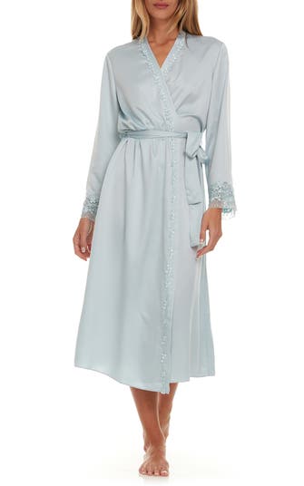 Delicate floral lace trims the cuffs and opening of this ultrasmooth satin robe that will wrap your body in comfort no matter what the occasion.