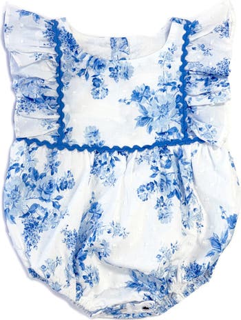 Ricrac trim and flutter sleeves sweeten this floral dot romper perfect for baby's warm-weather wardrobe.