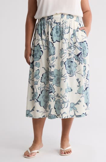 A charming floral print enhances the breezy appeal of a linen-blend skirt fashioned with a comfortably smocked waist and handy front pockets.