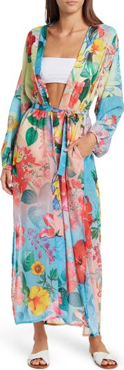 Unleash your free boho spirit in this long robe styled with vivid allover blooms.