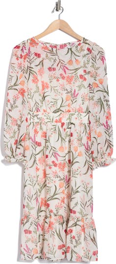 Colorful flowers brighten this charming midi dress framed by balloon sleeves with ruffled cuffs and a fluttery flounced hem.