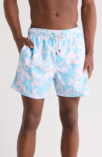 A stretchy, water-repellent fabric with a whimsical floral print keeps you comfortable in and out of the water in these swim trunks cut in an easy-to-move fit.