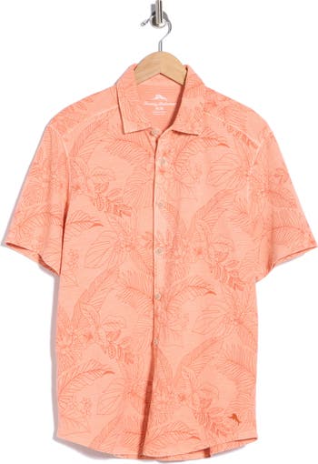 Tropical fronds invite cooling breezes and vacation vibes in this short-sleeve button-up shirt cut from a lightweight cotton blend.