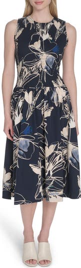 Sketched flowers illustrate this charming fit-and-flare midi dress balancing a smocked bodice with a flowy A-line skirt.