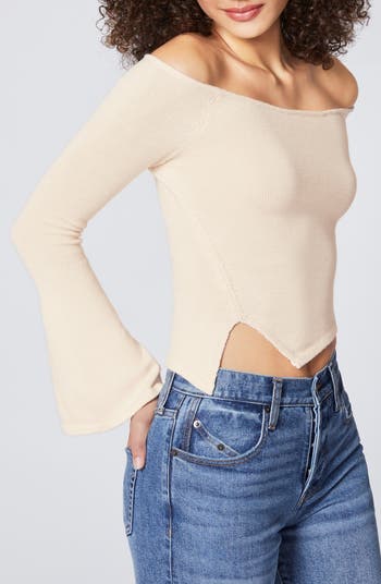 Worn off one shoulder or both, this wide-neck crop top with an asymmetric hem is a head-turning look for your next night out.