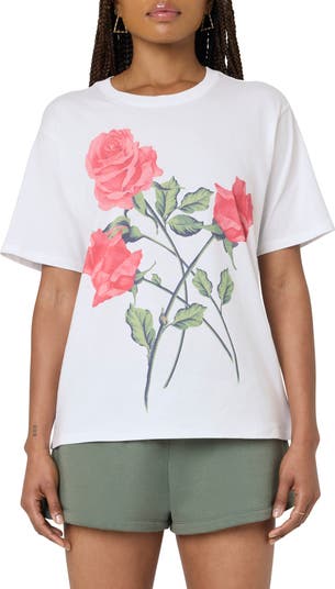 A trio of roses romances this boxy T-shirt crafted from pure cotton and framed by dropped shoulders for a relaxed fit.