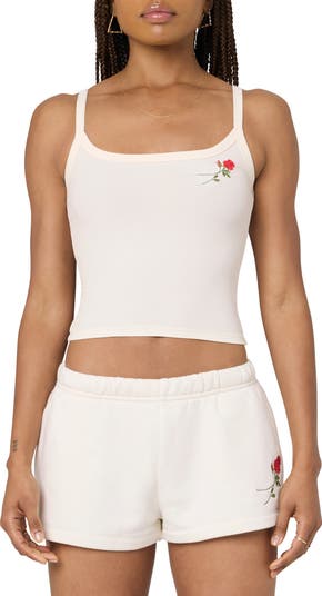 Lounge lavishly in this cropped tank that's fashioned from a softly ribbed cotton blend and embroidered with a dainty duo of roses.