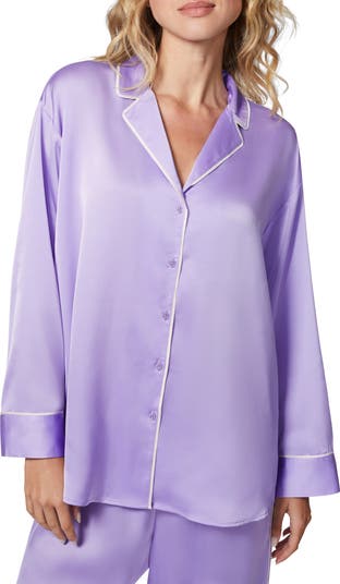 Sweet dreams await in this comfortably oversized pajama shirt offered in fun colors and patterns. Pearlescent buttons and classic piping complete the luxe look of this silky satin style.