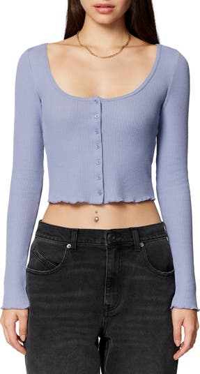 Frilly lettuce edges give a fun and flirty finish to this svelte cardigan that's completed by an alluring scoop neck.