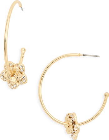 A polished flower outlined with glistening cubic zirconia stones blooms at the bottom of each hoop made from warm goldtone plate.