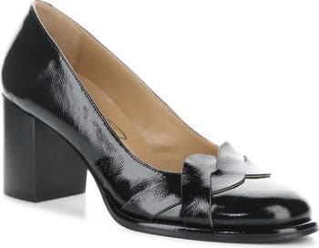 Woven vamp straps enhance the sophisticated style of this almond-toe pump boosted by a lofty block heel.