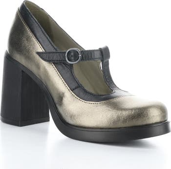 This T-strap pump is lofted on a soaring block heel and grounded on a cushioned footbed.