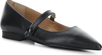 A mary jane strap furthers the timeless appeal of a pointy-toe flat shaped from smooth leather and grounded by a well-cushioned footbed.