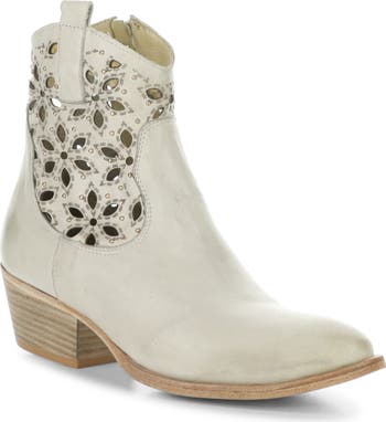 A short western boot takes a sophisticated turn thanks to dainty floral cutouts accentuated by polished studs.