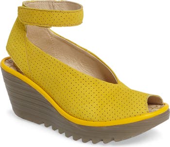 Pinhole perforations pattern a peep-toe leather sandal ascending a rugged, go-anywhere wedge.