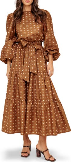 Billowy balloon sleeves and a voluminous tiered skirt bring the drama to this charming cotton maxi dress accented by a removable tie belt.