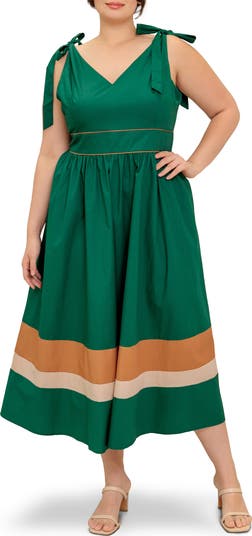 Feel confident from date night and beyond in this fit-and-flare dress styled with a striped hem and adjustable tie straps.