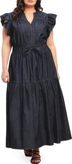 Perfect to dress up or down, this cotton-blend denim maxi dress is fashioned with fluttery cap sleeves, a removable tie belt and gracefully tiered skirt.
