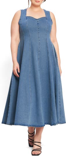 A sweetheart neckline lends charming detail to a fit-and-flare dress cut from stretchy cotton denim in a maxi silhouette.