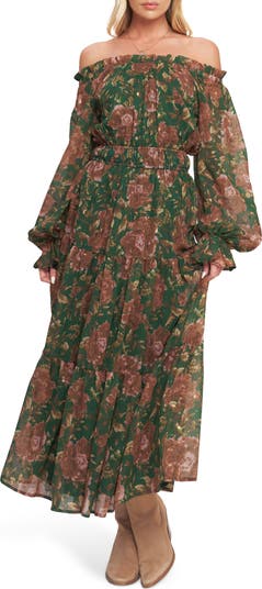Effortlessly romantic, this floral maxi stuns with its smocked silhouette and off-the-shoulder neckline.