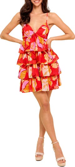 A plunge neck leads to a frilly tiered skirt on this floral minidress perfect for sunny special occasions.