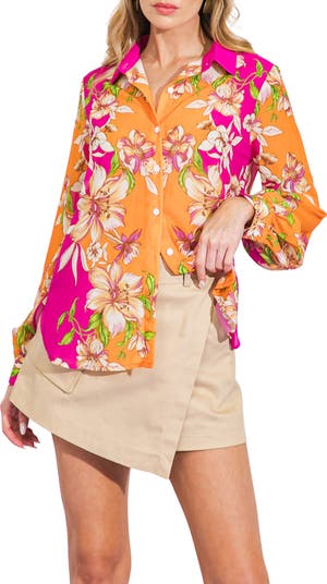 Pretty blooms add a dose of sweetness to a button-up shirt cut from airy woven fabric for a comfortable fit.