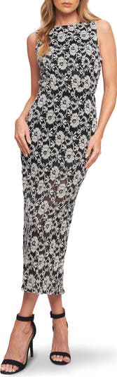 Two-tone floral lace enhances the romance of this sleeveless stretch-lace midi dress fashioned with an alluring open back.