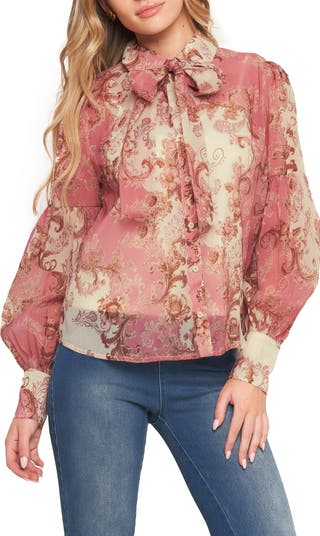 A charming paisley floral print sweetens this airy button-up shirt framed by an elegant tie neck and voluminous bishop sleeves.