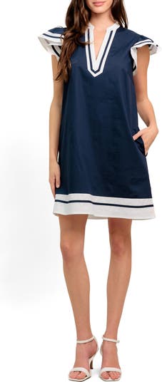 Contrasting trim highlights the V-neck, frilly sleeves and hem of this cotton minidress.