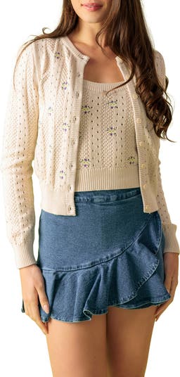 Embroidered flowers and a dainty pointelle pattern adds a whimsy finish to this coordinated cami and cardigan set.